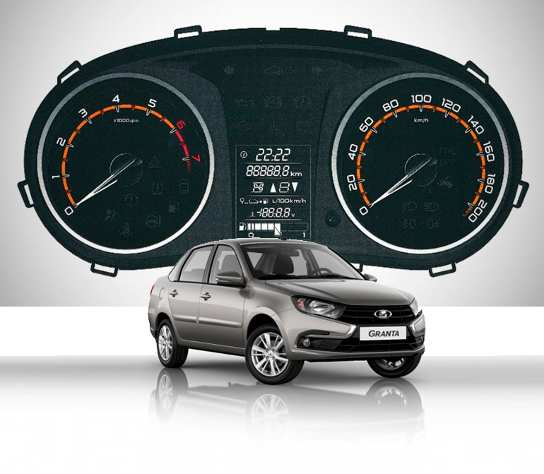 Панель приборов для Lada Granta получила стандартное расположение экранов. Слева мы видим круглую шкалу тахометра, а справа в аналогичном виде - спидометр. Между двумя кругами - дисплей бортового компьютера, который будет монохромным. Цифры на тахометре и спидометре расположены по кругу.