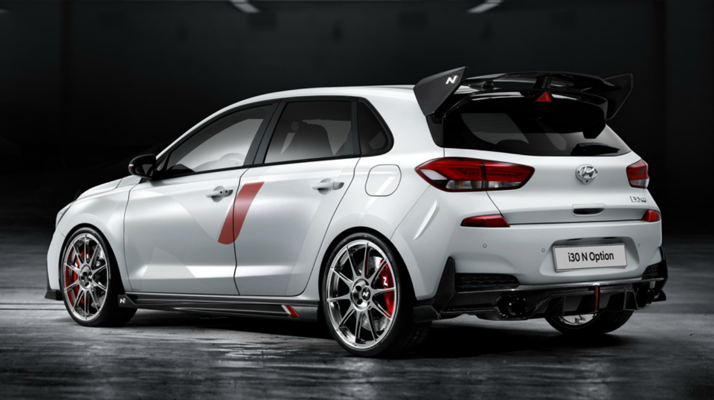 Этот технофутуризм дополнен углепластиковыми капотом с вентиляционными прорезями и сплиттером. Hyundai i30 N Option получил также новые выхлопные патрубки, фальшрадиаторную решётку и задний бампер.