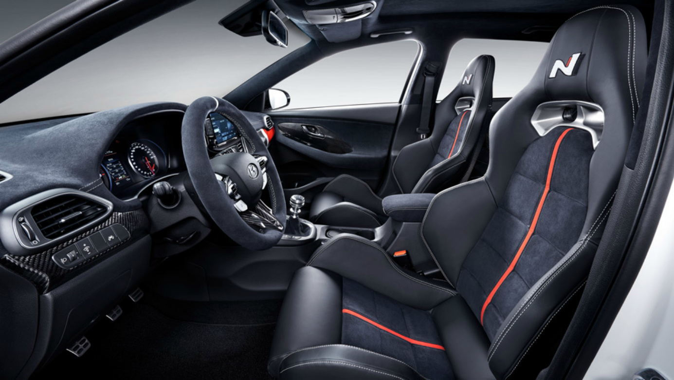 В салоне новинки замечены новый руль, обшитый алькантарой, и декоративные вставки на дверях и передней панели (тоже обтянутой алькантарой по верху), сделанные из того же углепластика. Кроме того, наличествуют педали и рычаг переключения передач нового дизайна. Всего же в i30 N Option появилось 25 новых деталей экстерьера.