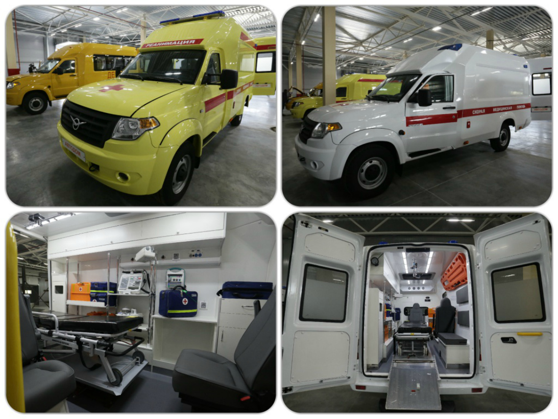 «Скорая помощь», получившая заводской индекс УАЗ-128811, оснащена всем необходимым для подобных автомобилей. А в кузове школьного автобуса УАЗ-128801 установлено 14 комфортабельных пассажирских кресел.