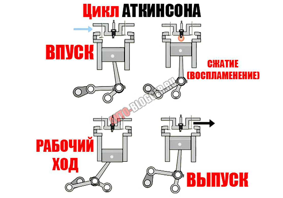 Но на гибридных автомобилях, где бензиновому двигателю помогает электромотор, обладающий линейными характеристиками мощности и момента, плюсы цикла Аткинсона перевешивают его минусы.