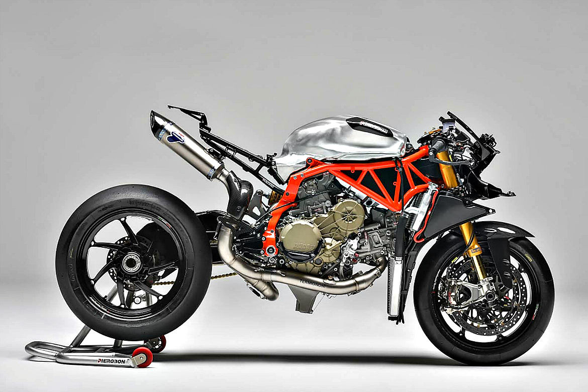 Вот и Pierobon X85R укомплектован L-Twin'ом Ducati Superquadro, применяемым на моделях 899, 959, 1199 и 1299. В стандартном варианте этот 2-цилиндровый мотор жидкостного охлаждения с углом развала цилиндров в 90 градусов при объёме 1299 куб. см. развивает мощность 195 л. с. и крутящий момент 135 Нм.