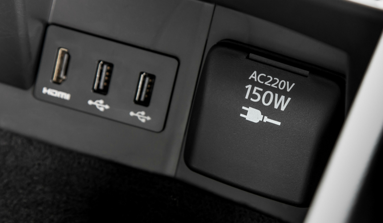 В салоне машины появились розетка на 220 В для приборов мощностью до 150 Вт, USB-разъём для подзарядки гаджетов во 2-м ряду сидений и мягкие накладки на тоннеле в зоне колен водителя и переднего пассажира.