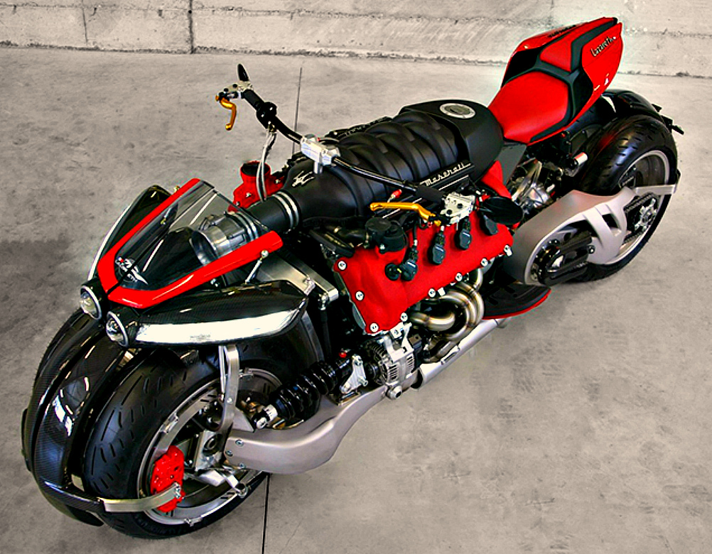 Людовик Лазарет не стал размениваться на мелочи: «эпицентром» его байка стал бешеный мотор от одного из спорткупе Maserati. Этот бензиновый V8 с турбонаддувом имеет объём 4,7 л. и развивает мощность 470 л. с. при крутящем моменте в 620 Нм.