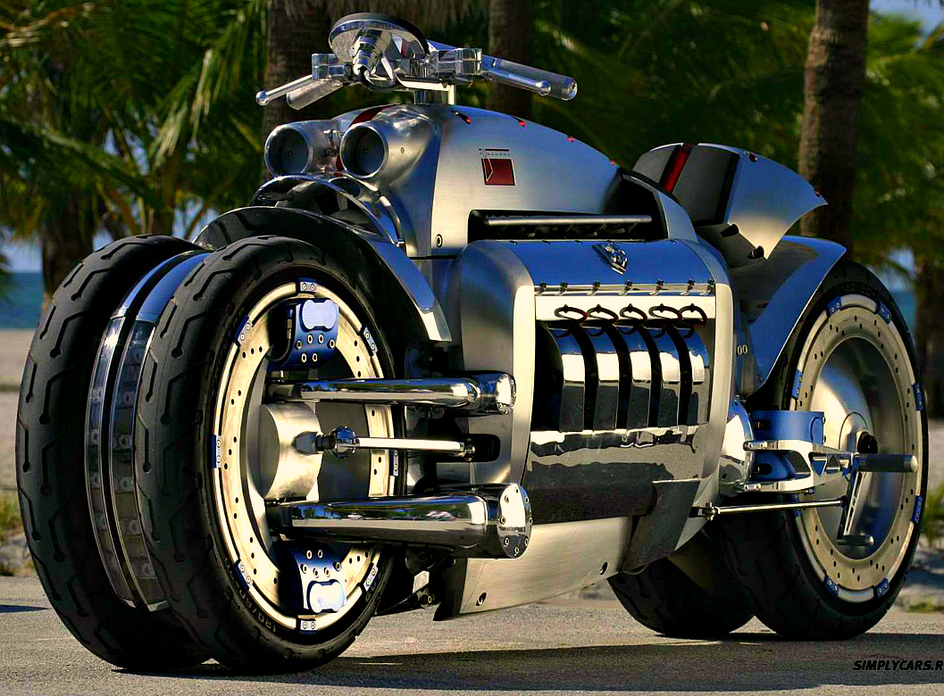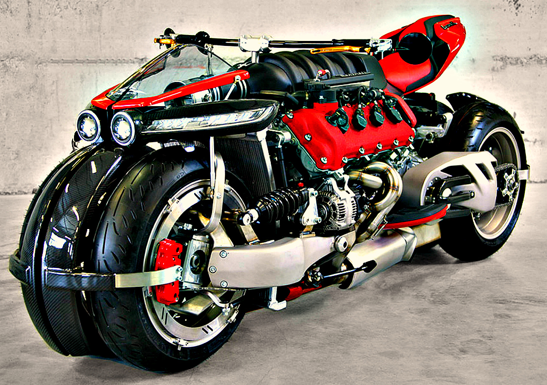 Нет, не трайк, а 4-колёсный мотоцикл. Но при этом он и не квадроцикл: его колёса — и передние, и задние — расположены почти вплотную друг к другу. В ходовой части Людовик Лазарет использовал ту же схему, что на американском концепт-байке 2003 г. Dodge Tomahawk.