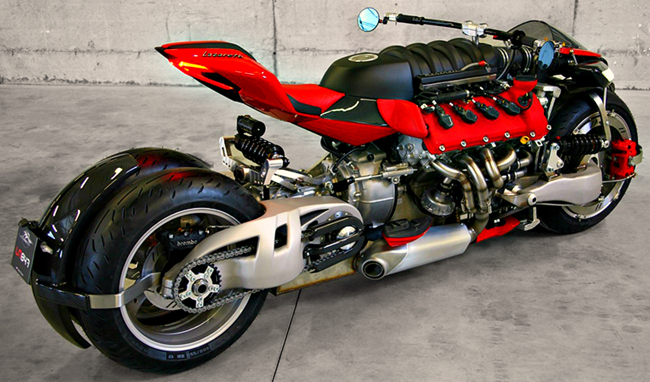 Его основанная в Италии компания под названием Lazareth (просто и красноречиво!) выпускает отнюдь не традиционные, «по уши» залитые хромом, кастомы с V-twin'ами. Мотоциклы Лазарета создаются с одной целью — рвать соперников в клочья, что по динамике разгона, что по максимальным цифрам на спидометре.