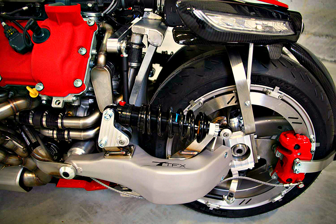 Особенность его конструкции — каждое колесо подвешено на отдельном рычаге с амортизатором. Это позволяет наклонять мотоцикл в поворотах и способствует тому, что он лучше «держит» траекторию движения — что на прямых, что в виражах.