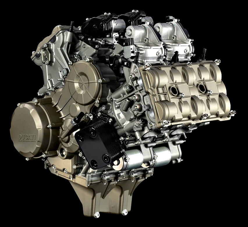 Напомним, что представляет собой этот движок. Он 4-цилиндровый, жидкостного охлаждения, имеет по 4 клапана на цилиндр. Привод клапанов — фирменный для Ducati десмодромный. Двигатель моноблочный, агрегатируется с 6-ступенчатой коробкой передач.