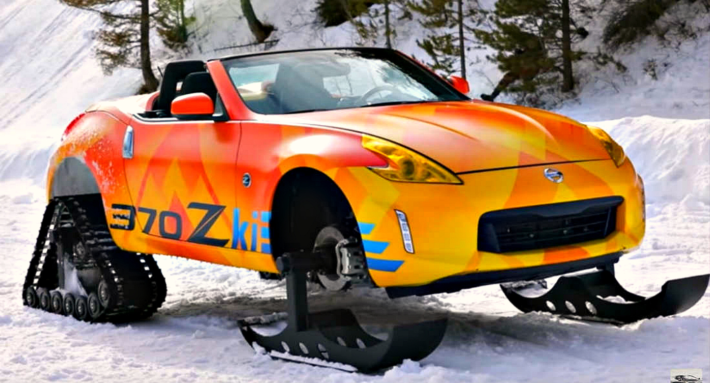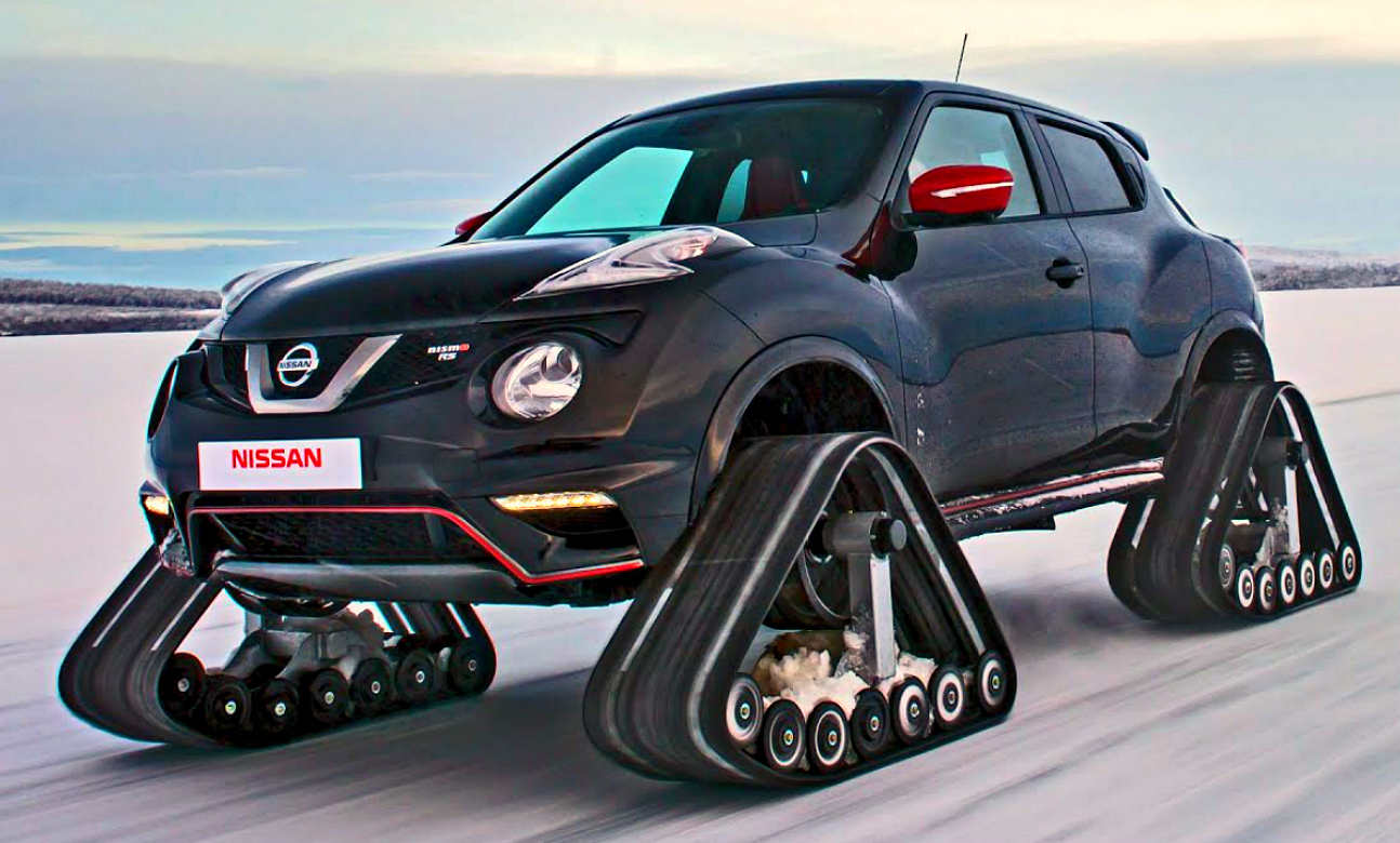 Впрочем, в Nissan просто обожают снабжать гусеницами свои авто — взять, хотя бы, показанный в феврале родстер (!) 370ZKi с гусеницами на задней оси, и лыжами вместо передних колёс. А ещё в 2015 г. был показан гусеничный прототип Juke Nismo RSnow.