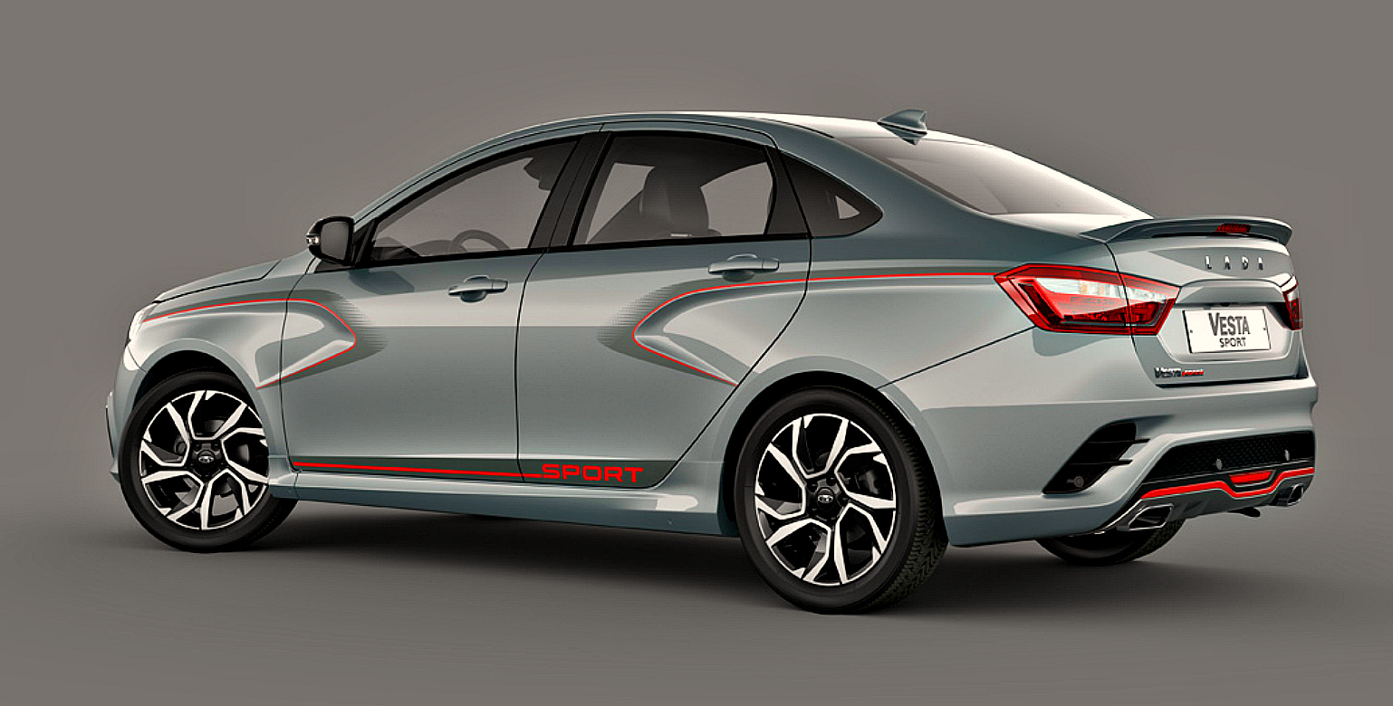 Внешне Lada Vesta Sport отличается от обычной аэродинамическим обвесом, спойлером на крышке багажника, установленной на крыше антенной-«плавником» и 17-дюймовыми колёсами оригинального дизайна.