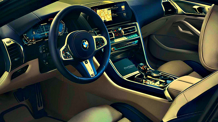 Салон BMW M850i xDrive Coupe First Edition тоже доработан специалистами из BMW Individual. Он обшит дорогой кожей Merino 2-х цветов — Ivory White и Night Blue, а потолок отделан алькантарой цвета Night Blue.