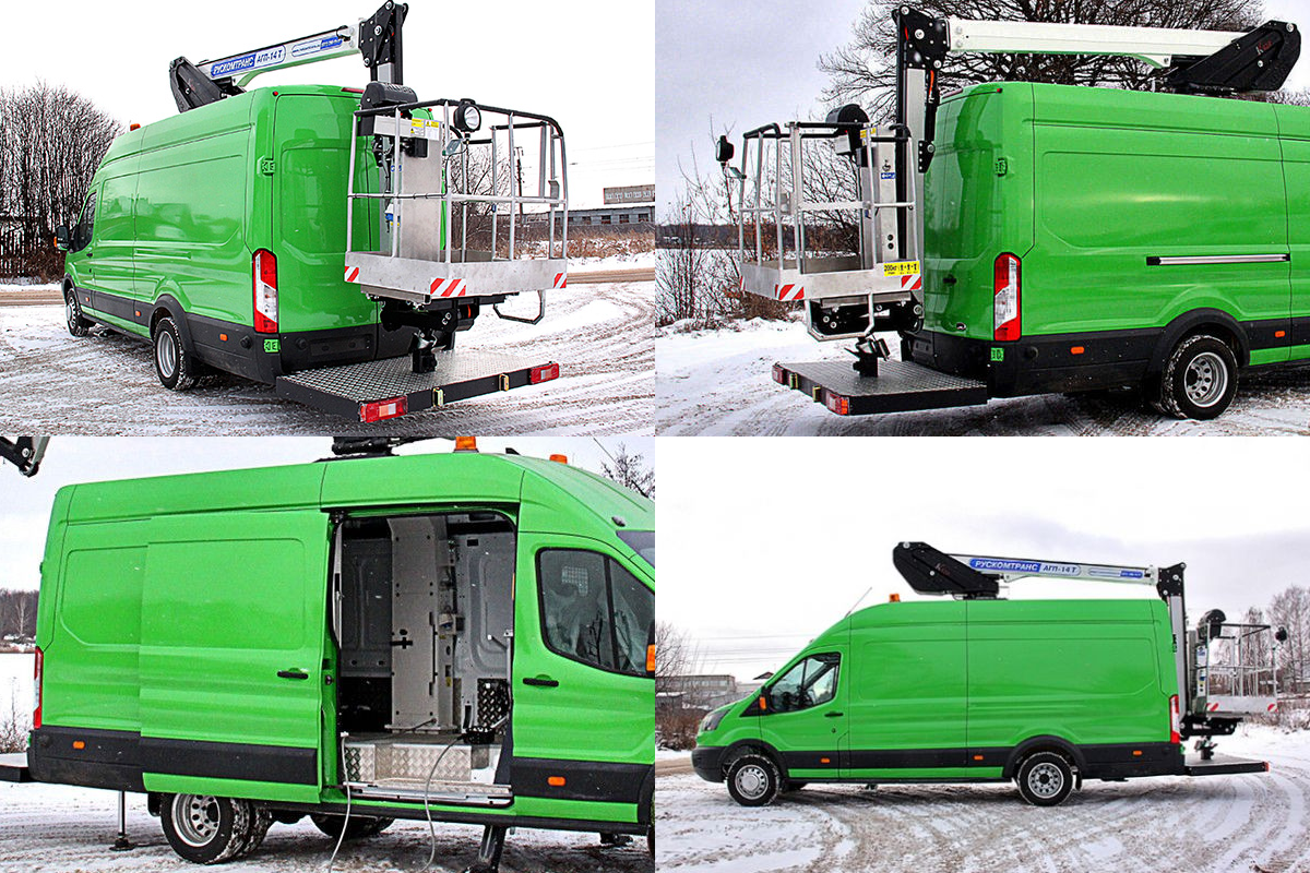Новая спецверсия Ford Transit АГП-14Т создана на основе цельнометаллического фургона с длинной базой и высокой крышей. Он оснащён 136-сильным турбодизелем объёмом 2,2 л., от которого приводится и гидравлический насос вышки.