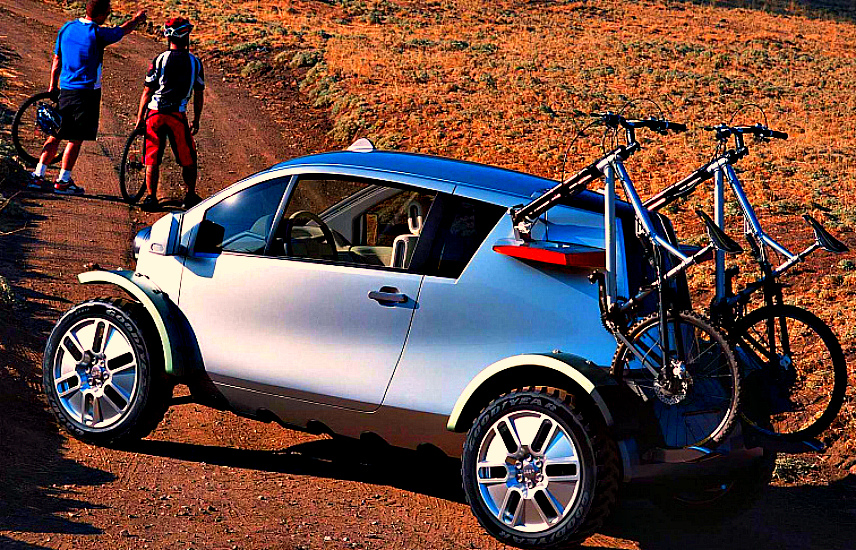 Этот 3-местный электромобиль с планировкой салона 2+1 был компактным и лёгким: его длина составляла всего 3 235 мм, а вес — 816 кг. При этом Jeep Treo был полноприводным — на каждой его оси «сидел» отдельный электромотор, причём питались они не от аккумуляторной батареи, а от водородной ячейки.