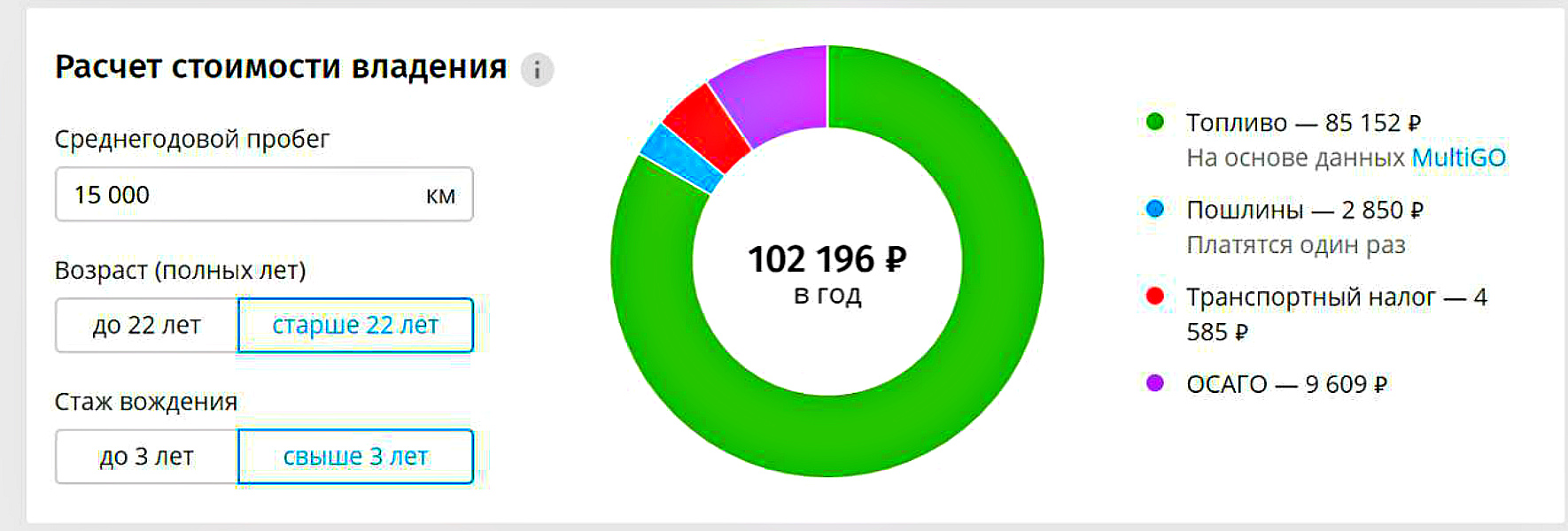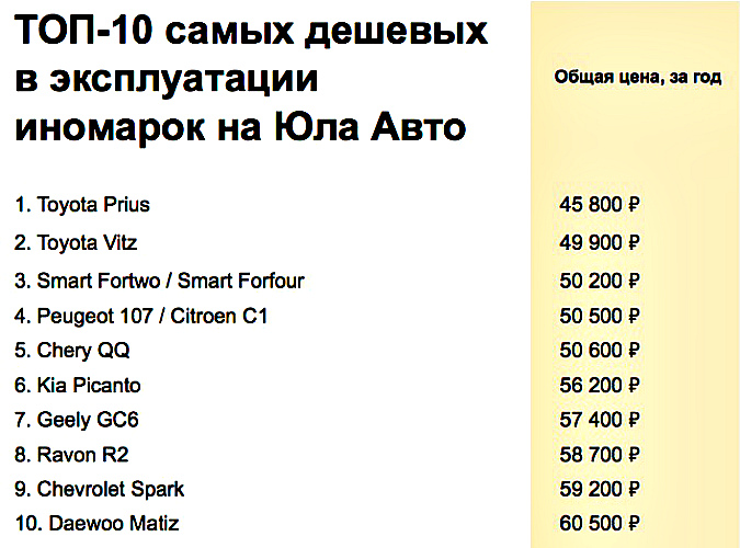 При этом система учитывает затраты на топливо, размер госпошлины и транспортного налога, а также стоимость полиса ОСАГО. При составлении рейтинга учитывались машины со среднегодовым пробегом в 15 000 км, водители которых были старше 22 лет, а их стаж составлял свыше 3-х лет.