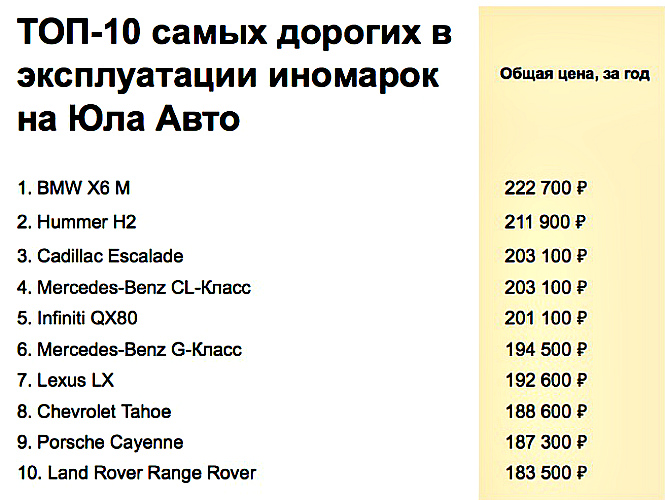 В «Юла Авто» также отдельно подсчитали затраты на горючее. Тут безоговорочным лидером стал американский внедорожник Hummer H2. Расход бензина в городском цикле езды у него составляет 36 л/100 км, поэтому владелец этого громилы оставляет на АЗС по 132 400 руб. в год. тысячи рублей в год.