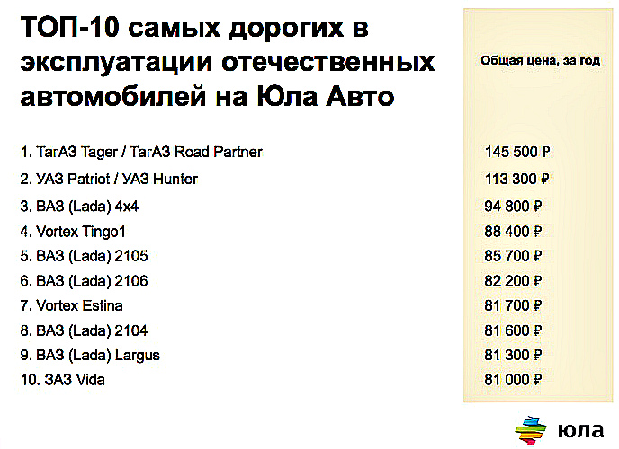 Данные по некоторым другим маркам опубликованы в приведённых выше таблицах. Правда, тут возникает пара вопросов. Во-первых, почему уважаемые эксперты «Юла Авто» причислили к отечественным украинскую марку «ЗАЗ»?