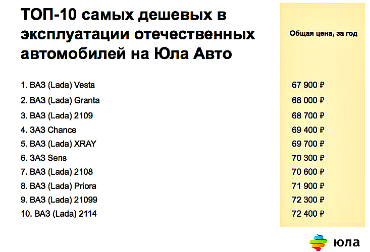К такому выводу пришли эксперты интернет-сервиса «Юла Авто». Для этого они проанализировали стоимость эксплуатации 400 000 машин отечественного и зарубежного производства в 2018 г.