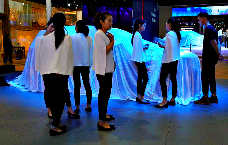 Обставлено это было по-восточному загадочно. Сперва новинка под белоснежным покрывалом долго стояла в окружении очаровательных китаянок, похожих на изящные фарфоровые статуэтки. Затем они одним движением сняли чехол, и перед зрителями предстал 4-дверный седан ультрасовременного дизайна, окрашенный в золотистый цвет.