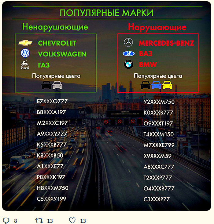 Выяснилось, что в течение последних 6-ти месяцев на столичных дорогах чаще всего нарушали ПДД водители автомобилей Mercedes Benz, BMW и «ВАЗ», окрашенных в чёрный, синий или жёлтый цвета. Самыми же культурными оказались владельцы Chevrolet, «ГАЗ» и Volkswagen.
