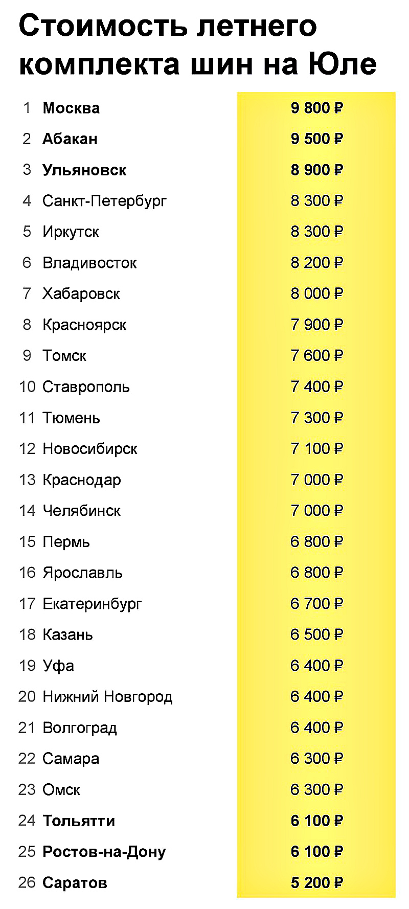 Самые же низкие цены на летнюю резину зафиксированы в Саратове (5 200 руб.), Ростове-на-Дону и Тольятти (по 6 100 руб. за комплект).