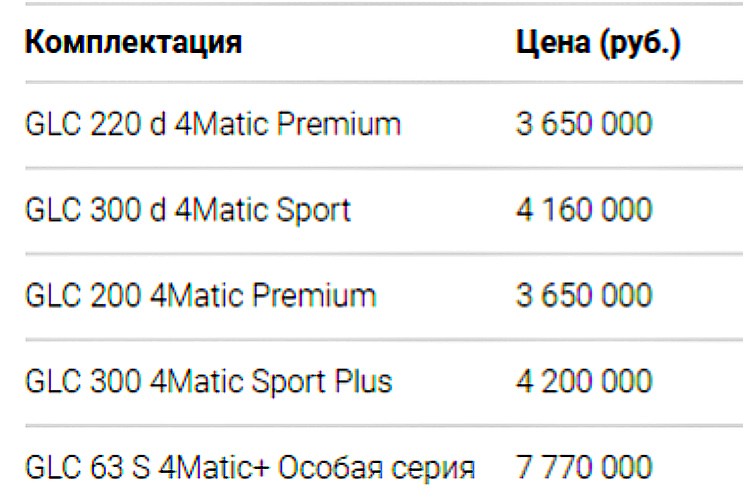 Раз Mercedes-Benz GLC обновился, то и цены на него, соответственно, выросли. Начальная версия Mercedes-Benz GLC 220d 4Matic Premium теперь стоит 3 650 000 руб., а топовый кроссовер Mercedes-AMG GLC 63 S 4Matic+ обойдётся покупателю в 7 770 000 руб.