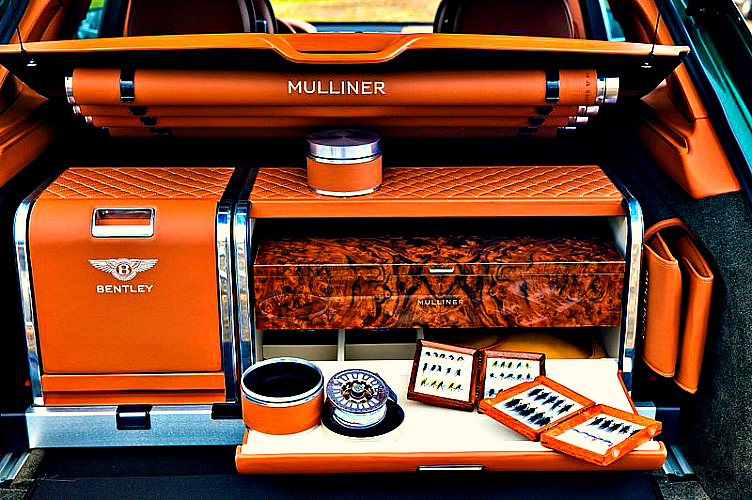 Всё это обшито дорогой кожей коричневого цвета с серебристыми логотипами Bentley и Mulliner. Весь набор Fly Fishing располагается в багажнике, который оснащен специальными креплениями для него.