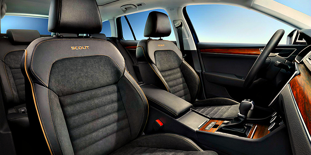 Skoda Suberb Scout будет только универсалом — выпуск лифтбеков такого же типа не планируется. Салон автомобиля богато оснащён и комфортабелен, как и положено машинам бизнес-класса. Его обшивка сделана комбинированной из качественной кожи и износостойкой ткани, а сам салон украшен декоративными элементами из натурального дерева.