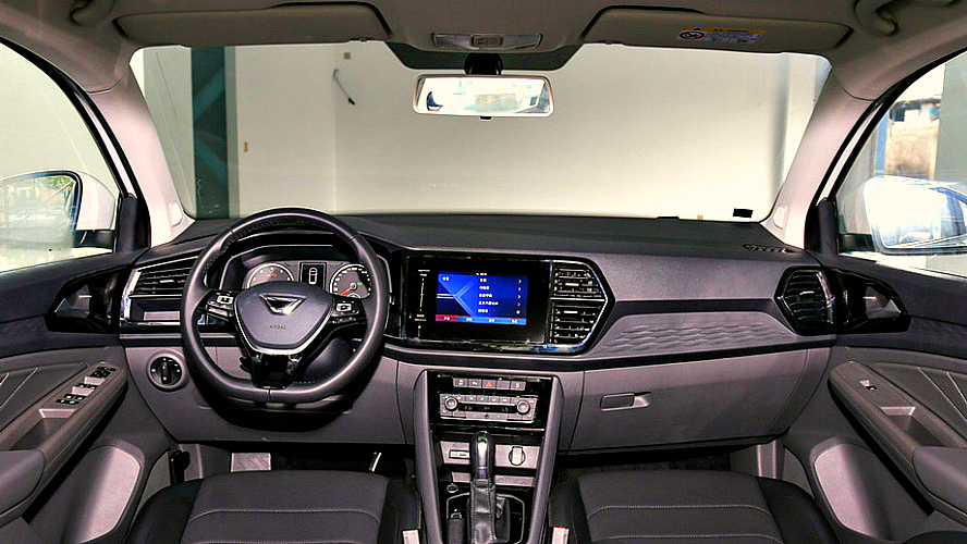 В салоне автомобиля имеются аналоговая панель приборов и простая мультимедийная система с тачскрином средних размеров. Материалы отделки — простые, но качественные ткань и пластик.