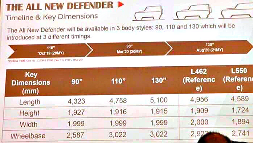 В марте 2020 г. стартуют продажи Land Rover Defender 90. Его длина — 4 323 мм, ширина — 1 999 мм и высота — 1 927 мм. Через 5 месяцев после него на конвейер встанет Land Rover Defender 130, с базой как у «110-го», но с более мощным мотором и увеличенной длиной — 5 100 мм.