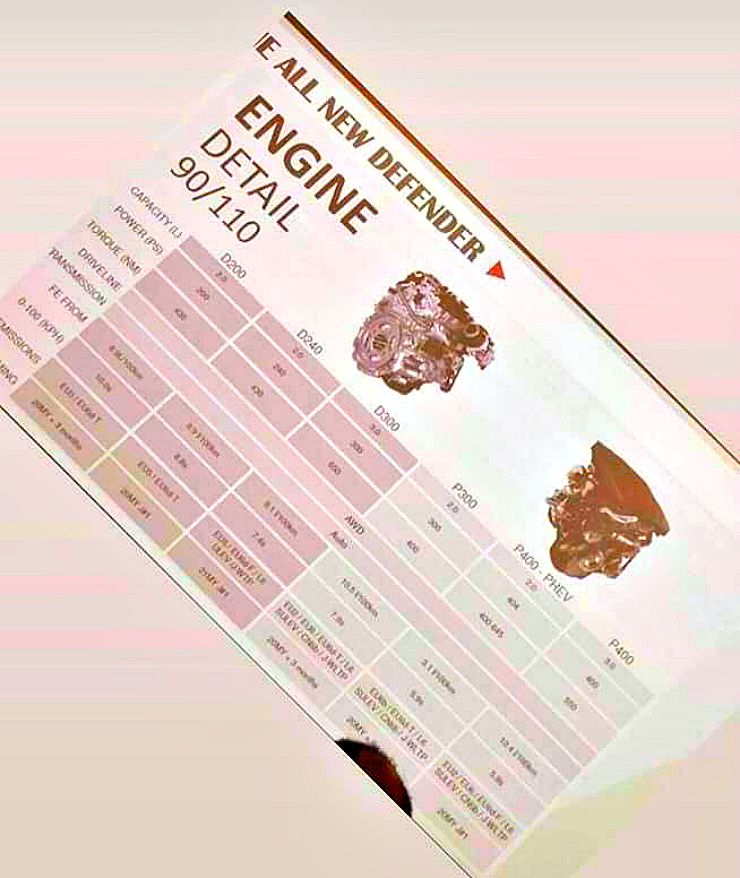 Под капотом Defender 90 и Defender 110 появятся 6 вариантов двигателей — 3 бензомотора и 3 дизеля. Все они 4-цилиндровые, объёмом в 2л. Их мощность фирма по традиции не разглашает, но величина крутящего момента известна — 400 Нм для бензомоторов и 430 Нм — для дизелей.
