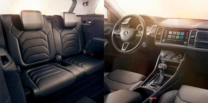 Внутри салона оборудовано большое количество ниш для хранения вещей, в том числе специальный ящик под сидением переднего пассажира. Отличительная особенность модели SUPERB, наличие фирменных зонтов в карманах дверей, также получила свою реализацию и в новом Kodiak.