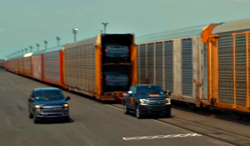 Предсерийный образец электропикапа взял на буксир 10 2-этажных вагонов-автовозов, загруженных 42-мя пикапами F-150. Общий вес состава получился равным 454 т.