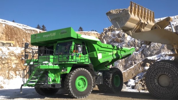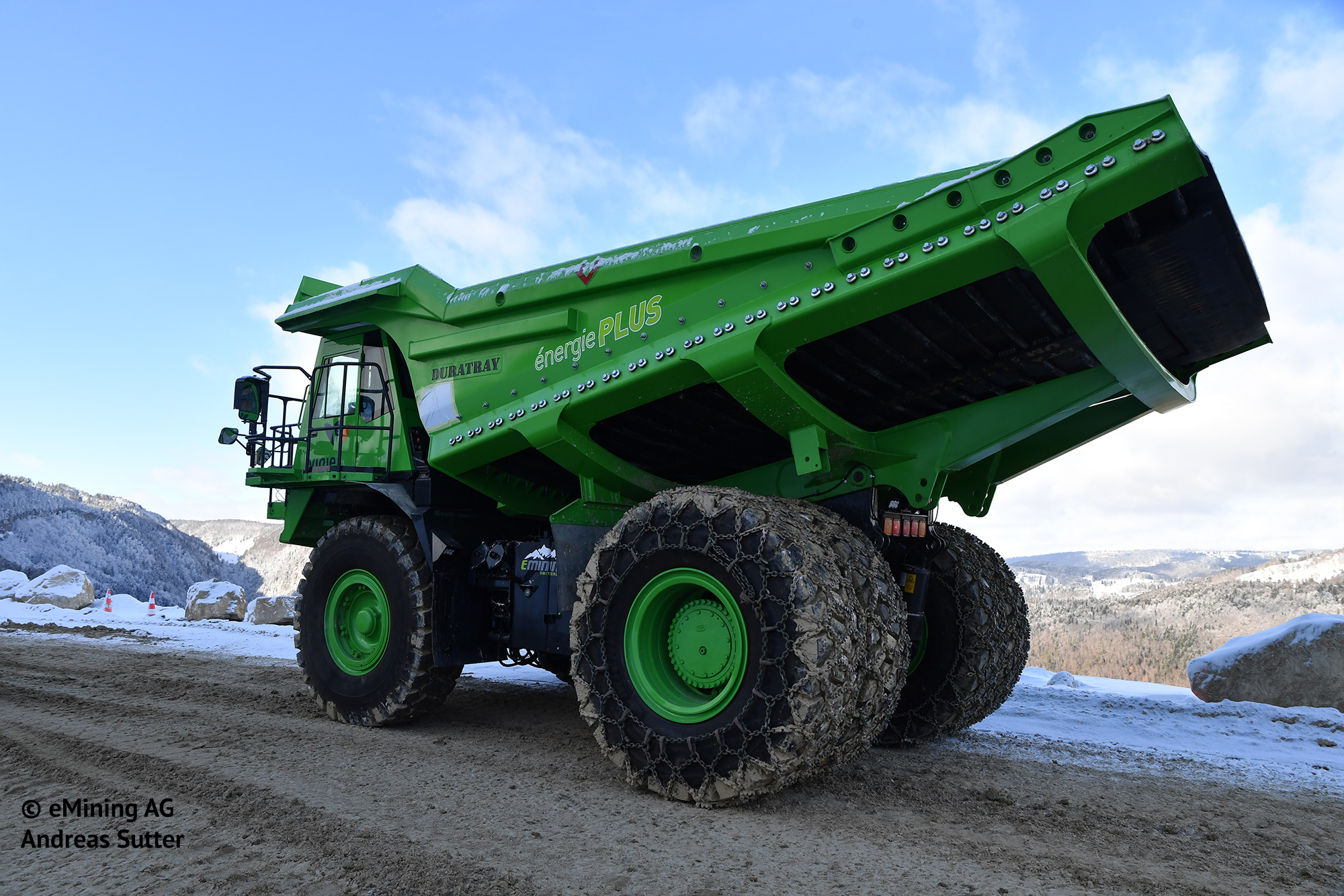 Электросамосвал уже работает на известковом карьере около швейцарского городка Биль. Он возит добываемую известь из карьера на погрузочную площадку.