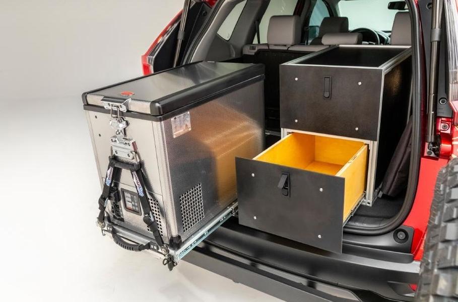 Для удобства путешественников в багажнике автомобиля установлен модуль Plateau с миниатюрным холодильником и выдвижными ящиками для продуктов, утвари и разных бытовых мелочей. Есть также небольшой плоский кофр на крыше.
