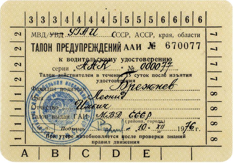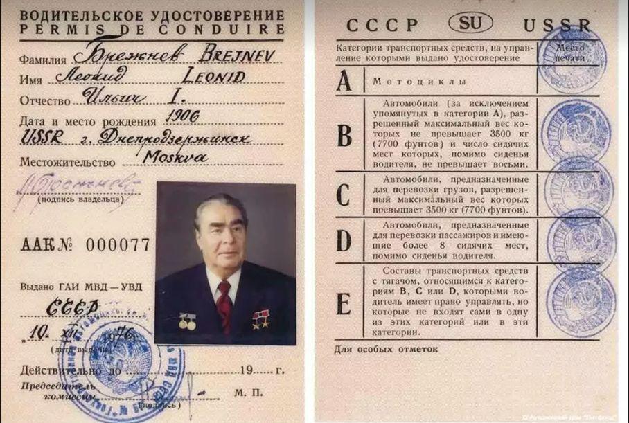 Судя по «правам», выданным в 1975 г., Брежнев мог управлять всеми транспортными средствами — от мотоцикла до тяжёлого грузовика с прицепом. К водительскому удостоверению приложен талон предупреждений, в котором нет ни одного «прокола» за нарушения ПДД.