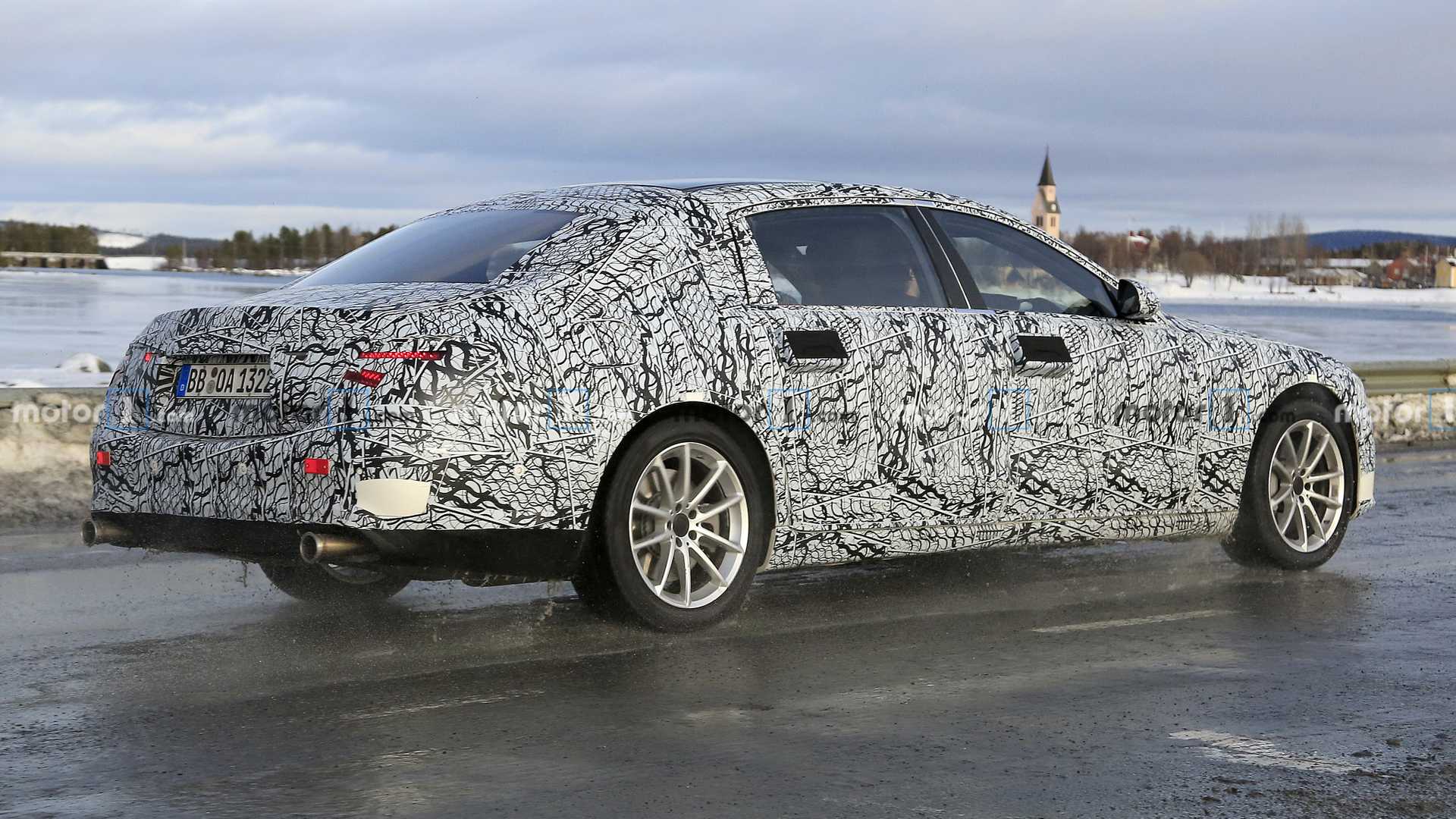 Внушительный седан плотно закамуфлирован, но видно, что форма его кузова стала более плавной и округлой. Кроме того, на фотографиях новинки отлично видны выдвижные дверные ручки, пусть и прикрытые чёрными «заплатками».