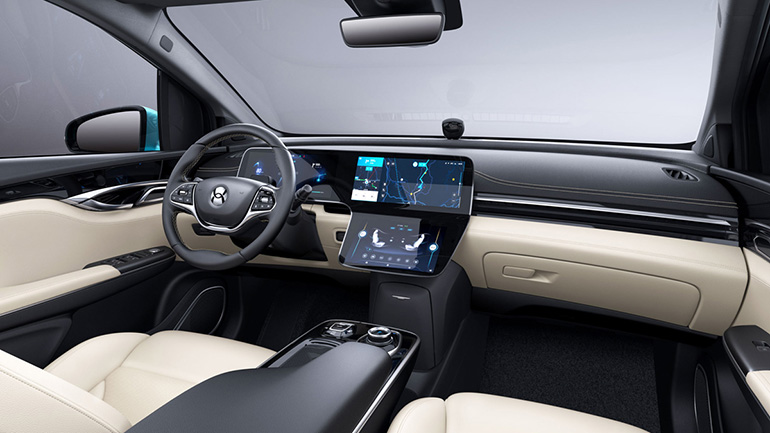 В штатное оснащение электромобиля входят светодиодная оптика, цифровая «приборка», круговой видеообзор, адаптивный круиз-контроль с функцией мониторинга занимаемой полосы и систему слежения за усталостью водителя.