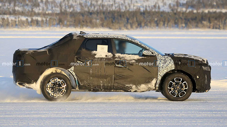 Пикап покрыт плотным слоем камуфляжа, однако некоторые подробности рассмотреть удалось. Например, видно, что очертания передней и пассажирской частей кузова новинки выполнены в стиле кроссовера Hyundai Santa Fe нового поколения.