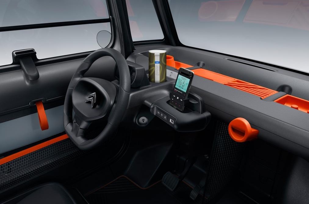 Интересной особенностью электромобиля стало отсутствие приборной панели и мультимедийной системы. Их заменяет обычный смартфон, для которого на «торпеде» около руля предусмотрено специальное гнездо с разъёмом для подзарядки.