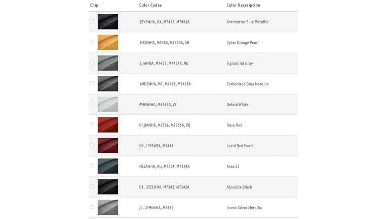 Как сообщил автомобильный интернет-портал Automotivetouchup.com, среди колеров для Ford Bronco предусмотрены как классические, так и современные варианты. Среди первых, например, имеются серебристый оттенок Iconic Silver Metallic и жёлтый Area 51, а среди вторых — оранжевый Cyber Orange Pearl и ярко-красный Race Red.