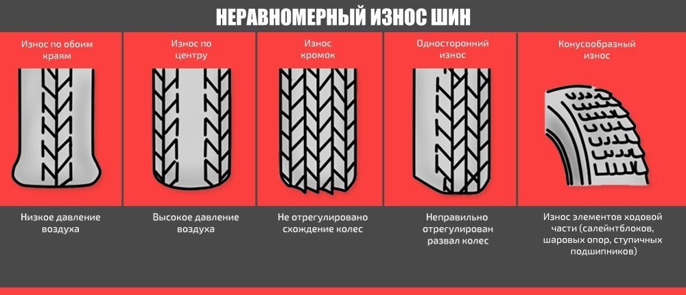 Например, пилообразный износ указывает на неправильно выставленный угол схождения колёс. Преждевременный износ внешних сторон протектора указывает на неверный угол развала. Если же протектор переднего колеса стирается с внутренней стороны – неисправен рычаг подвески.