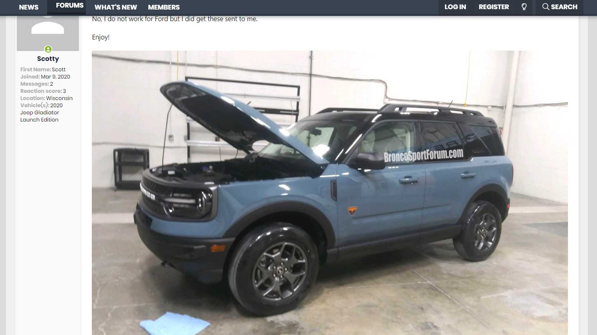 Ford Bronco Sport был отснят спереди, сбоку и сзади. На форуме, где были выложены фотографии, сообщили, что папарацци не работает в фирме, что сомнительно — иначе как бы он получил доступ к автомобилю.