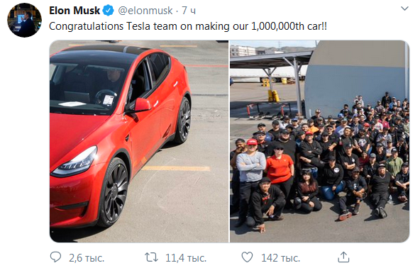 Основатель фирмы, Илон Маск, поздравил её сотрудников в своём Тwitter-аккаунте. Он также отметил, что Tesla стала первым автопроизводителем, который изготовил 1 000 000 «зелёных» машин.