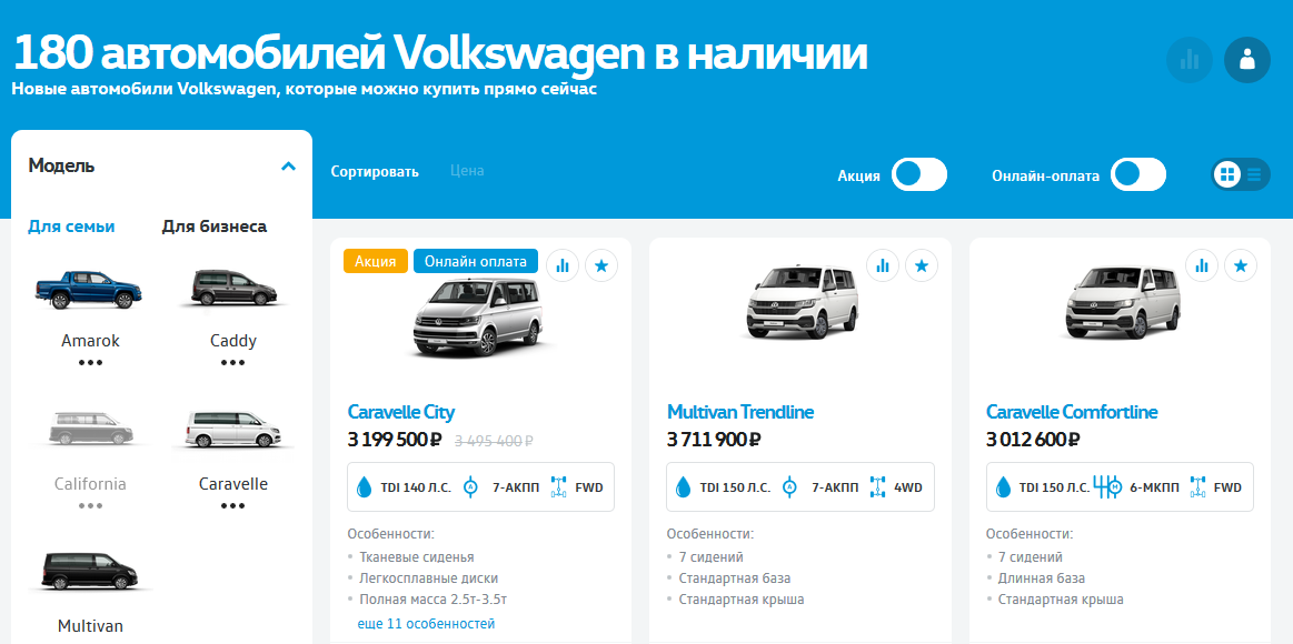 Для виртуальной покупки доступны все комплектации моделей Multivan, California, Caravelle, Transporter, Crafter, Caddy и Amarok. Новый сервис даёт возможность выбрать нужную модель и комплектацию, провести её дистанционный осмотр и проверить сопутствующие документы.