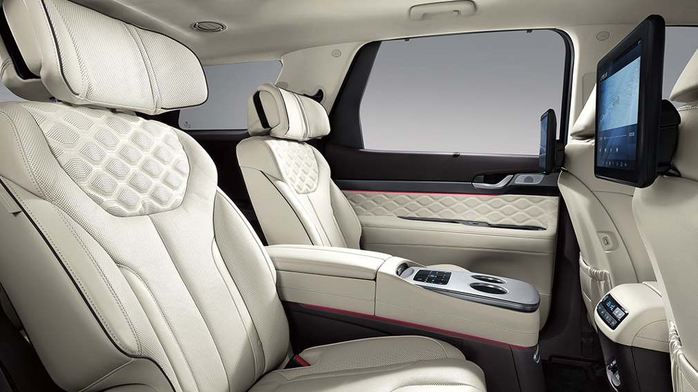 Hyundai Palisade VIP имеет 3-рядную 6-местную компоновку салона. Во 2-м ряду установлены огромные кресла с широким диапазоном регулировок. Между ними расположен подлокотник с боксом, в который встроен ионизатор воздуха.