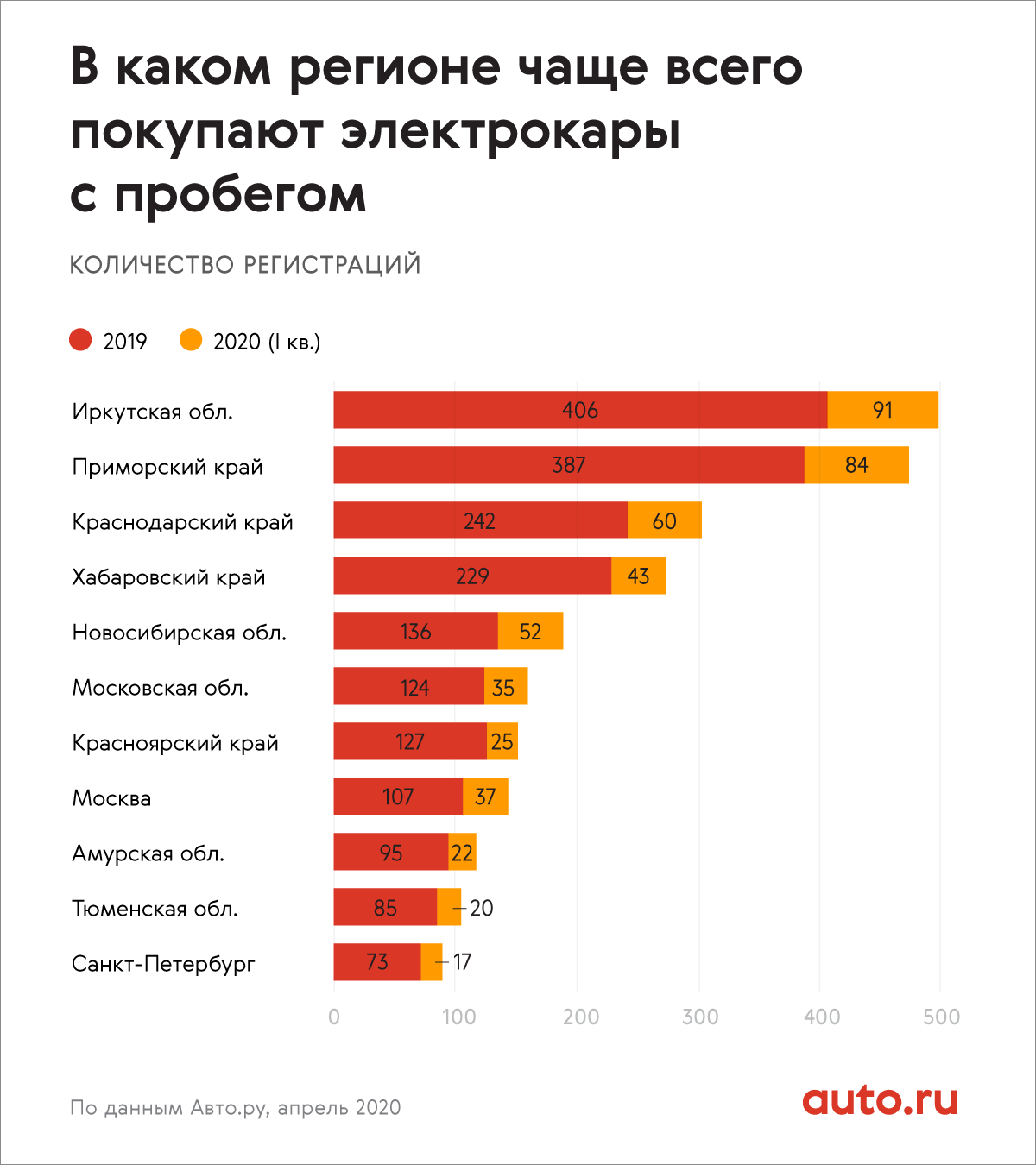 За 12 месяцев 2019 года и 3 месяца 2020 года суммарно в этих регионах зарегистрировано около 1 тыс. электрокаров. В Москве и области за тот же период поставлено на учёт 303 таких машины, а в Краснодарском крае — 302 электрокара.