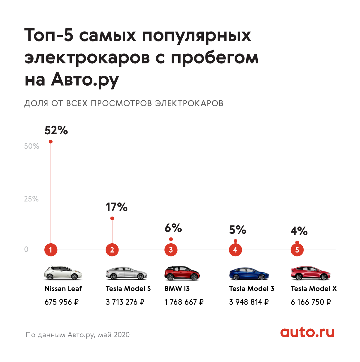 По данным сервиса «Авто.ру», чаще всего из автомобилей с электродвигателем на вторичном рынке можно встретить модель Nissan Leaf. В первую очередь благодаря тому, что перепродаётся много моделей первого поколения. Средняя цена по обоим поколениям — 680 тысяч рублей, а средний возраст — 7 лет.