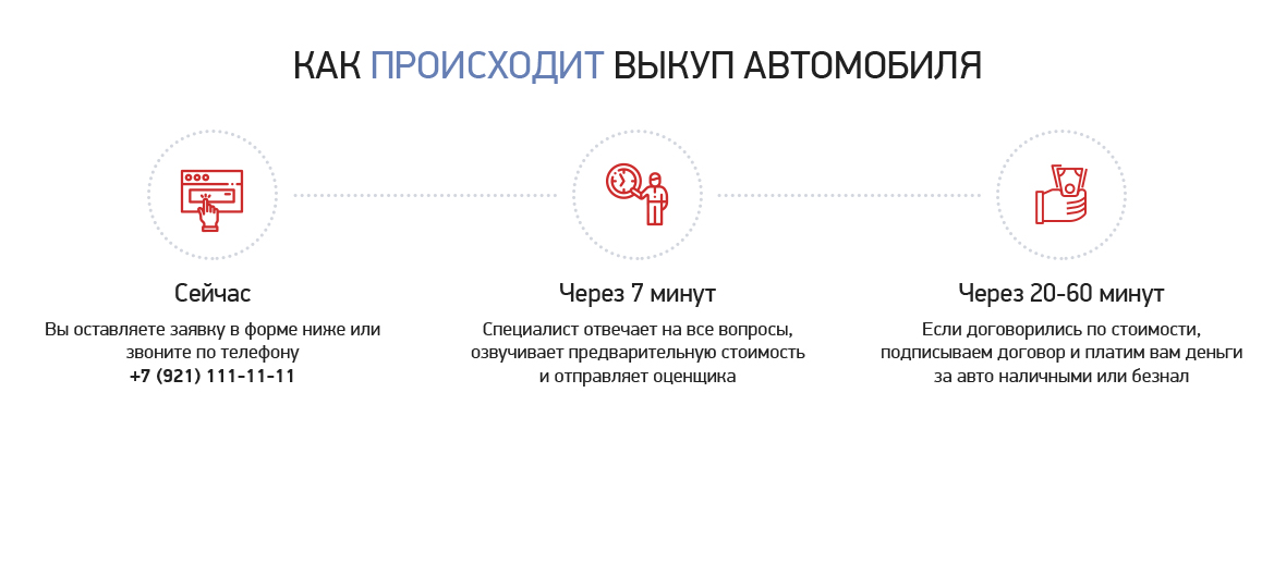 - Совершать поменьше телодвижений во время продажи авто. Все, что требуется от вас — обратиться к нам, остальное мы сделаем сами: специалист по оценке автомобилей выедет на объект, проведет оценку, мы составим договор и выплатим вам деньги — наличными или переведем на карту;