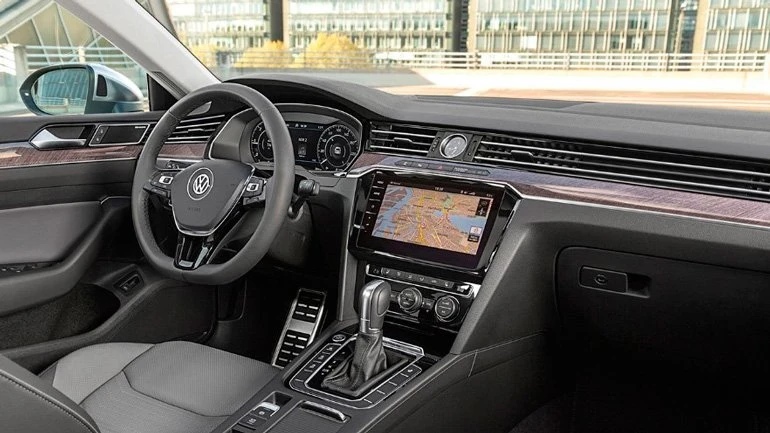 Комплектация Volkswagen Arteon R-Line Premium получила функцию подсветки поворотов, «мультимедийку» с тачскрином диагональю в 9,2 дюйма, встроенным навигатором и голосовым управлением, панорамную крышу с люком и 19-дюймовые колёса Montevideo.