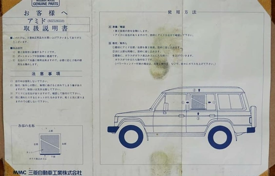 Аксессуар не самодельный, а именно заводского производства от самой компании Mitsubishi. И предназначен для первого поколения Mitsubishi Montero (так в США называется эта модель). Владелец этого автомобиля нашёл сетку, разбирая свой гараж — они даже ни разу не использовалась.